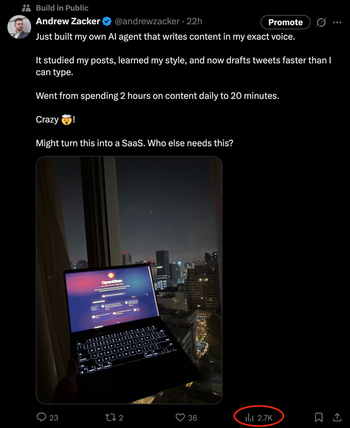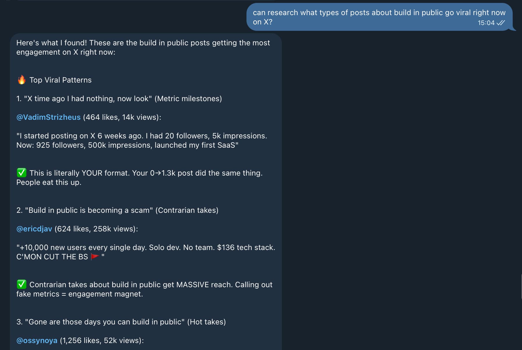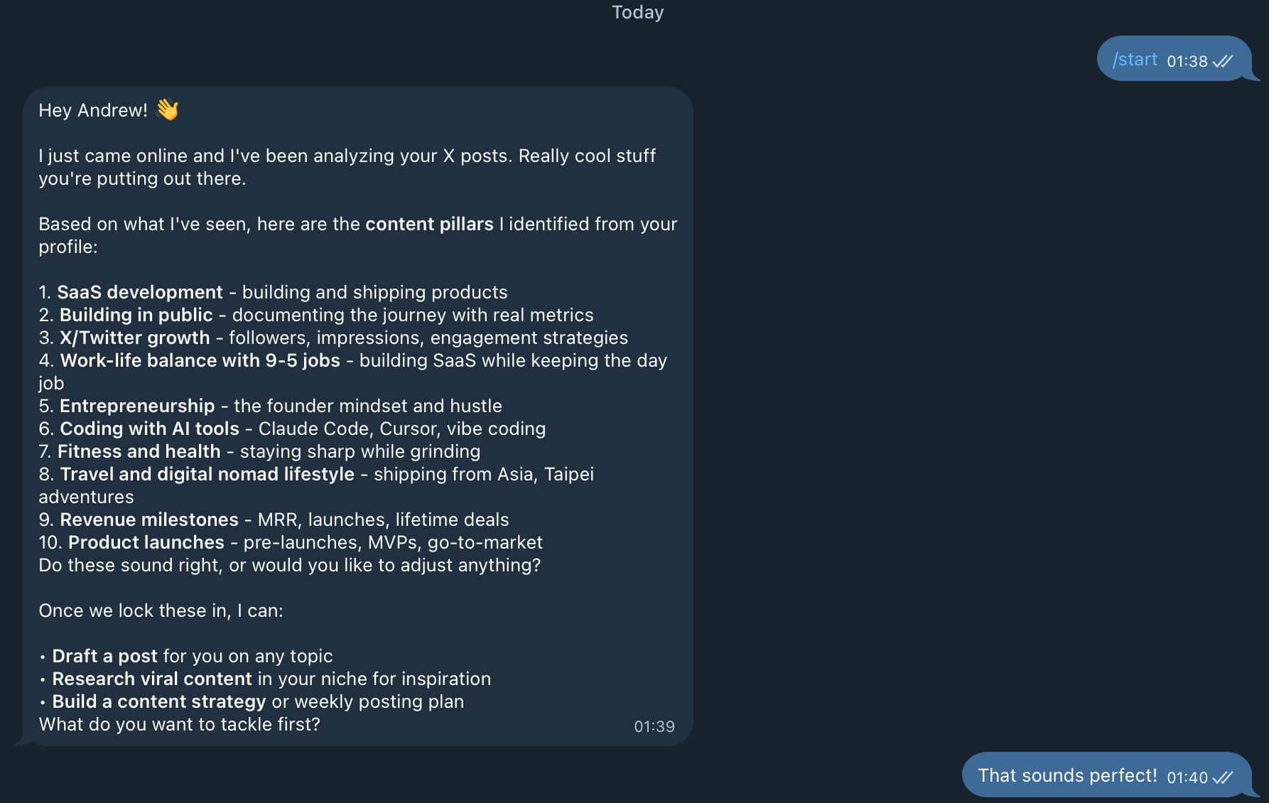 Analyzes your posts during onboarding and identifies your content pillars, tone, and personality. Every draft sounds like you, not like AI generated slop.